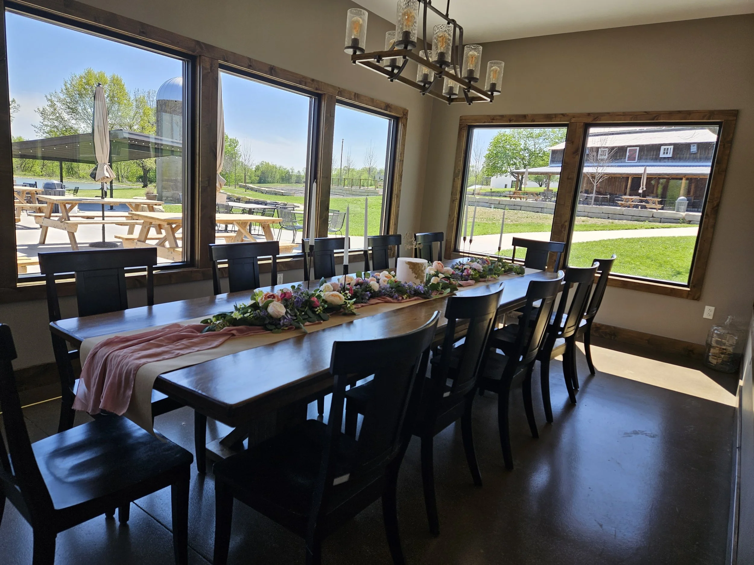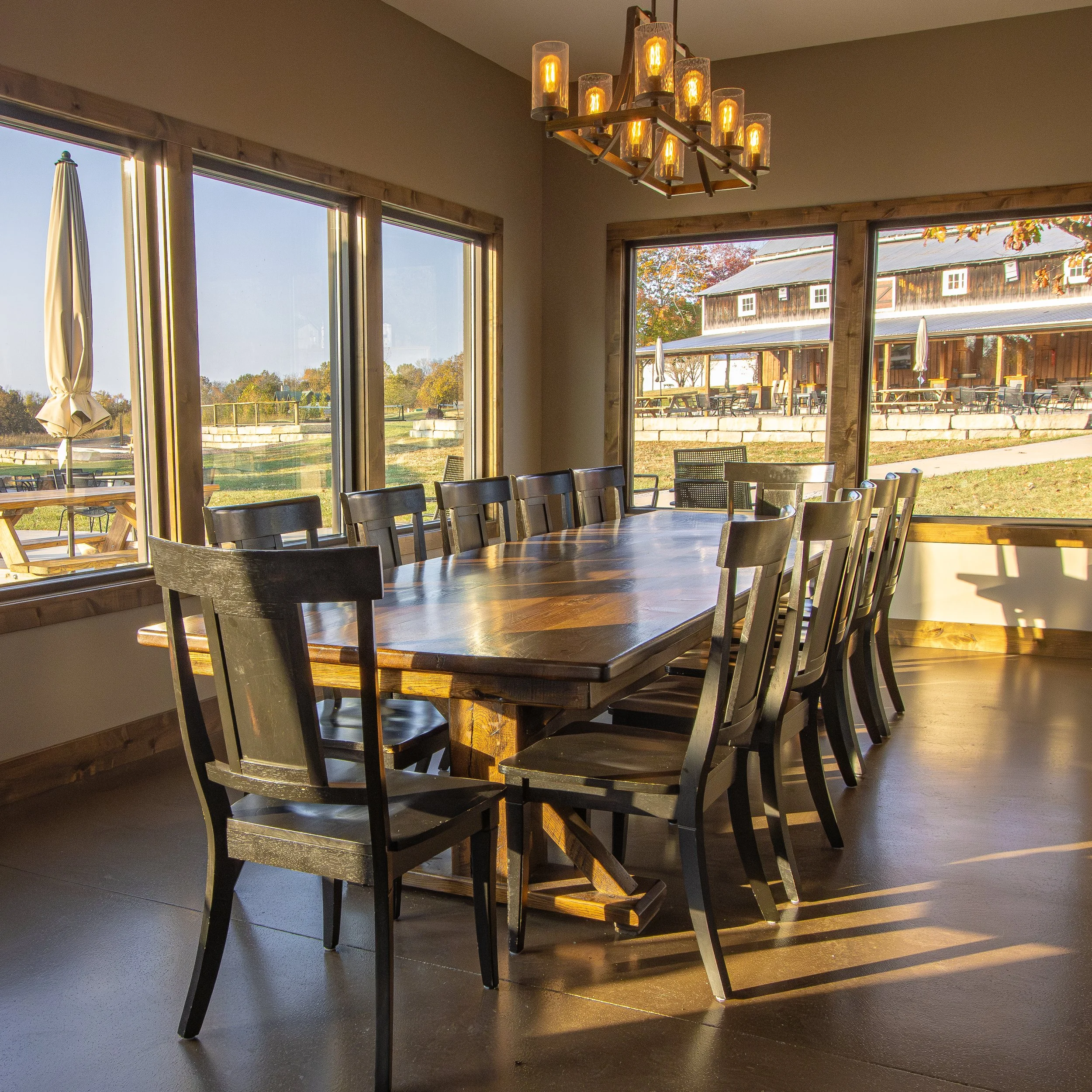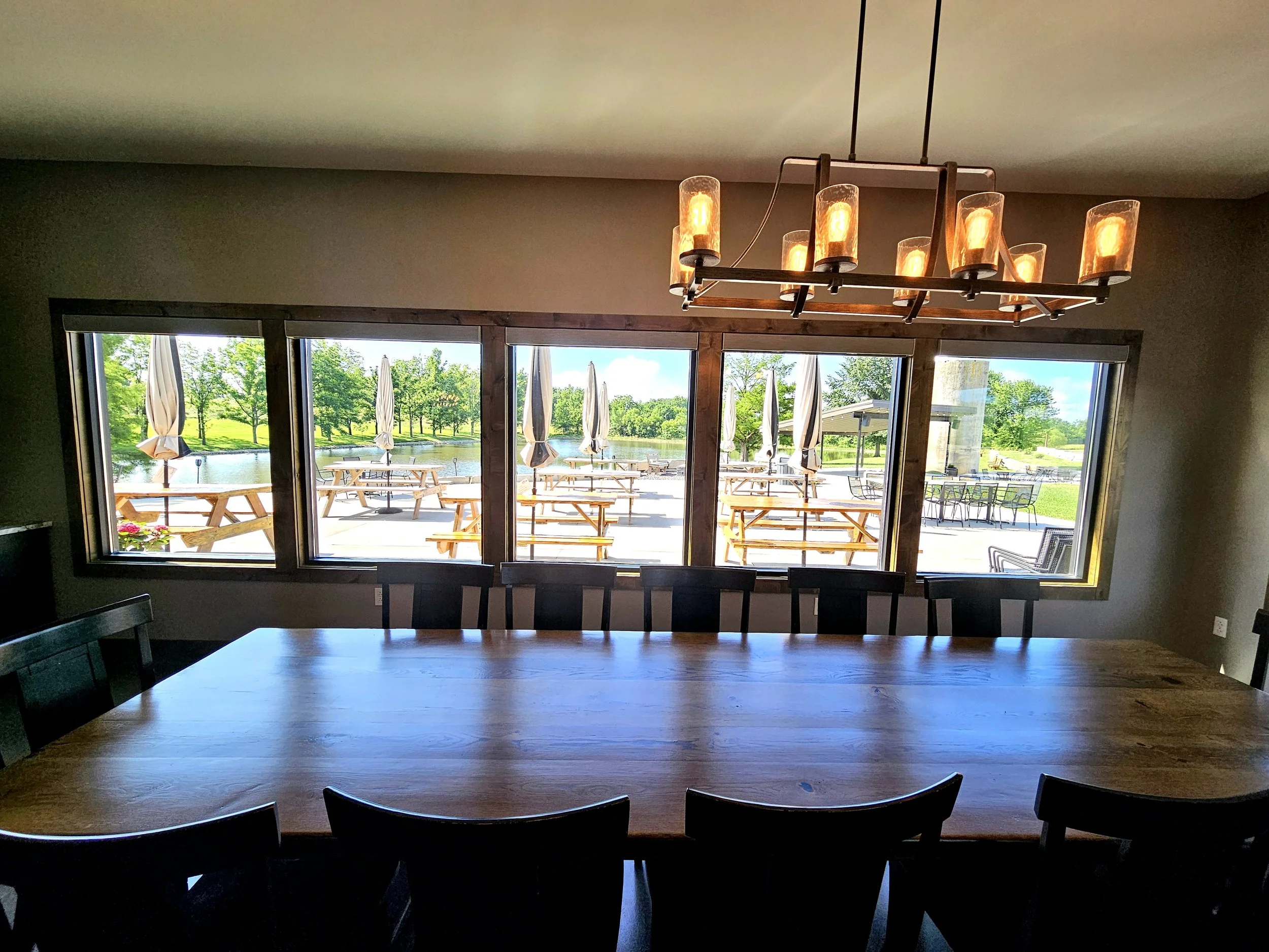 Located inside our Tasting Room, enjoy panoramic vistas of our grounds and the serene lake.
